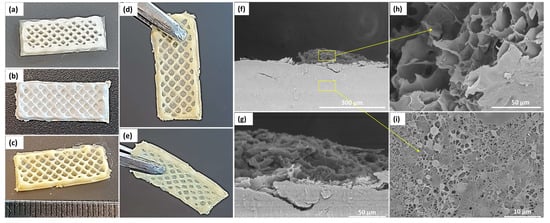 The structure of the bicomponent BiFp@Ht scaffold was accomplished by two innovative designing techniques, electrospinning and 3D-printing. The outer component was fabricated by the electrospinning method, obtaining a nanofibrous membrane loaded with pIMC (Fp), on which the Ht inner component was 3D-printed. The macro-morphology of BiFp@Ht is presented in Figure 4a–e, while the cross section of the bicomponent BiFp@Ht scaffold along with the micro-morphology of the two structures are presented in Figure 4f–i. In the recorded SEM images, the nanofibrous continuous architectures of the outer electrospun component and the highly porous structure with interconnected pores in the case of the inner 3D-printed hydrogel were very well highlighted.