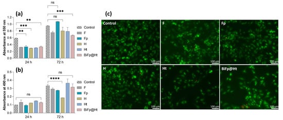 The MTT assay results (Figure 5a) indicated that after 24 h of culture, the cytocompatibility level of all analyzed structures was lower than that of the control. However, F, H, and Ht presented similar levels of cell adhesion, whereas Fp and BiFp@Ht were distinguished by a slight increase in the cell survival degree. Both the control and all samples showed a significant increase in cell viability and even a good cell proliferation potential after 72 h of contact with the culture medium, suggesting a great degree of cytocompatibility. The highest level of cell growth was reached by Fp that improved the cell viability value by three times in 72 h. This can be attributed to the nanofibrous architecture of the F membrane containing pIMC, which led to an increase in the material hydrophilicity (an indispensable property for cell adhesion) as well as to a slow and gradual release of IMC, without affecting the cells, as reported by previous studies [].