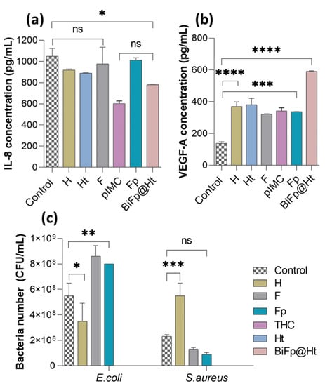 Immunomodulatory properties of the biomaterials assessed by quantifying the level of (a) IL-8 (ns p > 0.1, * p < 0.05) and (b) VEGF-A (*** p < 0.0005, **** p < 0.0001), after 24 h of incubation with HeLa cells; (c) evaluation of the antimicrobial activity of the formulations against E. coli (* p < 0.05, ** p < 0.005) and S. aureus (ns p < 0.5, *** p < 0.0005).
