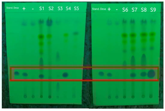 - Candra Purnama, R.; Made Laga Prandika, I. Identifikasi deksametason pada jamu habbatussauda yang beredar di toko obat daerah pasar tengah bandar lampung menggunakan metode kromatografi lapis tipis. Jurnal Analisis Farmasi 2018, 3, 1–8. [Google Scholar]