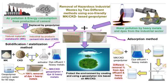 Geopolymers, commonly referred to as inorganic polymers, are three-dimensional amorphous or semi-crystalline alumino-silicate formations. They may be produced typically by alkaline activation and sometimes by acid activation of an alumino-silicate predecessor at room temperature or slightly above [2]. Additionally, geopolymers have received a lot of interest recently, especially in wastewater treatment for the removal of different kinds of contaminants, including heavy metals and dyes [3,24,25]. On the other hand, geological materials such as kaolin, metakaolin, and dolomite, as well as waste from industries such as slag, fly ash (FA), and sludge, can be used to create geopolymers as predecessors to alumino-silicates. Metakaolin (MK) is a frequently used alumino-silicate material for the production of geopolymer-based adsorbents because it has special adsorption qualities such as different structural selectivity, optimal sorption capacity, and cation exchangeable characteristics for different metal cations, which can be employed to improve the design of the processes of the treatment of waste water [26]. However, MK, a natural material, is a promising alumino-silicate material since it includes a variety of constituents that increase the adsorption performance of the geopolymer adsorbent, depending on the processing and initial material characteristics. [27,28]. Cement kiln bypass dust (CKD) is a fine powder that resembles Portland cement and ranges in color from gray to tan. It is a byproduct of the cement industry that is collected from electrostatic precipitators utilizing the dry process in large quantities. Several studies [29,30,31] examined the impact of CKD addition on the mechanical characteristics of the metakaolin-based geopolymer pastes. On the other hand, cementation materials or geopolymer binders were used in a few studies to study an innovative and efficient process of solidifying and removing reactive organic dye pollutants and heavy metals [32,33,34,35,36,37,38,39,40,41]. Our most recent investigations focused on the use of metakaolin as an adsorbent when combined with industrial wastes such as fly ash and ground granulated blast furnace slag for reactive dye removal [42,43,44,45,46,47].