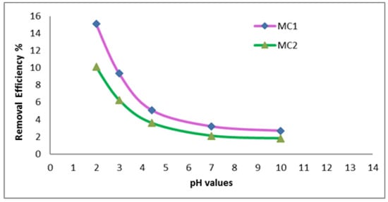 Figure 3 depicts the change in the removal % of dye when reactive black 5 dye was employed in the dye stream under the pH of the adsorption bath. Metakaolin/cement kiln dust based geopolymers-treated dye at various pH ranges (2–10), it was possible to estimate the ideal pH value for geopolymer cement. The percentage of dye removal efficiency decreased with increasing pH for all wastewaters, according to the results from Figure 3. Additionally, while employing geopolymer cement based on metakaolin/cement kiln dust (MC1 and MC2), which reached their maximum values at 15.1% and 10.1%, respectively, at pH 2, the percentage removal efficiencies for reactive black 5 dye effluents were at their highest levels.