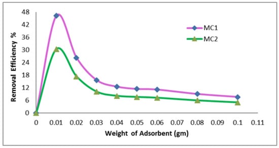 Figure 4 shows how the concentration of the adsorbent affects the percentage removal efficiency. The dye effluents for reactive black 5 with pH 2 for MC1 and MC2 geopolymer mix were used to test the dye’s adsorption at various concentrations (0.01 to 0.1 g/50 mL) of geopolymer cement for 120 min. The results of Figure 4 demonstrated that as adsorbent weight is increased, removal efficiency % decreases. The greatest removal efficiency % for the MC1 geopolymer mix was 46.3%, whereas the maximum removal efficiency % for the MC2 geopolymer mix was 30.4%, both at 0.01 g/50 mL.