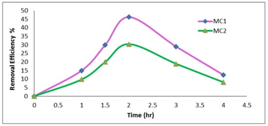 It is also important to note that the treatment was carried out using predetermined process settings for varying times (60–240 min) in order to identify the ideal duration of reactive dye interaction with the slag-based geopolymer blends. The findings in Figure 5 demonstrated how lengthening the adsorption time might increase the dye’s removal effectiveness. As the time passed, the amount of the removed color increased until it reached a maximum value, at which point removal efficiency % became steady. At 120 min, the decolorization rate for the MC1 geopolymer mix was 46.3%, and for the MC2 geopolymer mix it was 30.4%.
