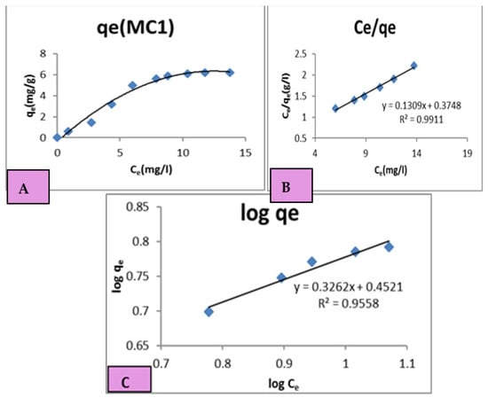 Kinetic models for the adsorption process onto the MC1 geopolymer mix: (A) Isotherm for MC1, (B) Langmuir Model for MC1, (C) Freundlich Model for MC1.