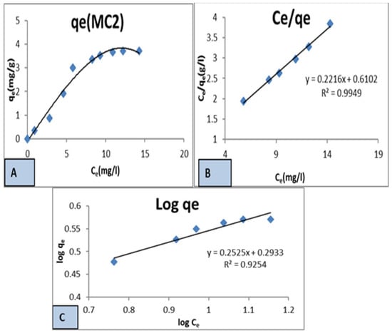 Kinetic models for the adsorption process onto the MC2 geopolymer mix: (A) Isotherm for MC2, (B) Langmuir Model for MC2, (C) Freundlich Model for MC2.