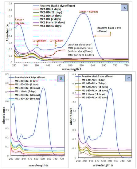 A leaching test can measure the quantity of dye and heavy metals released into the leachate solution during the curing treatment of geopolymer cubes at different hydration ages. An atomic absorption spectrophotometer (Savant AA-GBC Scientific Equipment, Australia) was employed to determine the quantities of cadmium and lead ions present in the leachate solutions. The quantity of the reactive black 5 dye effluent that remained in the leachates after different hydration period was additionally recorded using a spectrophotometer (V-670). Equation (3) was used to evaluate the leaching percentage (% L) of the reactive black 5 dyeing bath effluent, cadmium, and lead present in the leachate solution [35].