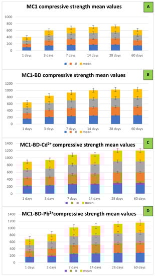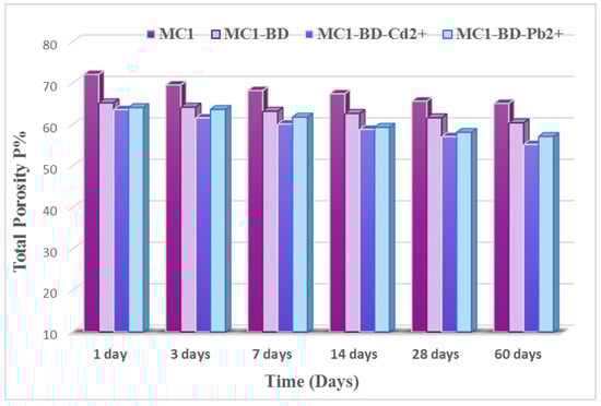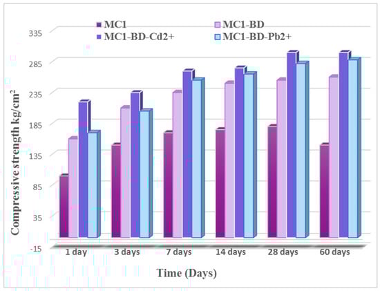 For both mechanical and leaching testing of the different geopolymer mixes (MC1, MC1-BD, MC1-BD-Cd2+, and MC1-BD-Pb2+), selected cubes from each geopolymer mix were cured in 100 mL of distilled water for different periods up to 60 days [32,36,41]. After each hydration interval, the cubes were removed from their curing condition, and the compressive strength, total porosity %, and leaching % for the wastes (dyeing bath effluent and heavy metals) were evaluated.