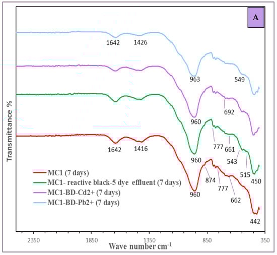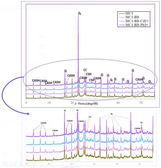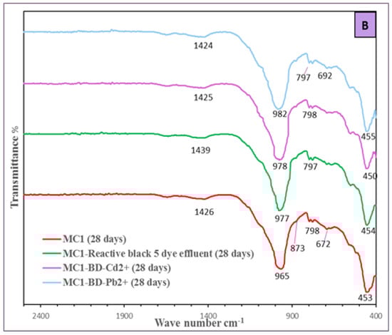 To create the geopolymer pastes (MC1, MC1-BD, MC1-BD-Cd2+, and MC1-BD-Pb2+), 80% metakaolin (MK) was thoroughly mixed with 20% cement kiln dust (CKD) in a dry environment until fully homogeneous. The separate alkaline activator solutions in the absence and presence of the reactive black 5 dye effluent (MC1-BD), dye effluent + Pb+2 ions (MC1-BD-Pb2+), and dye effluent + Cd2+ ions (MC1-BD-Cd2+) were generated. First, a uniformly distributed gel was created by effectively combining liquid sodium silicate and sodium hydroxide pellets in a 15:15 weight % ratio with the solid component. We replaced the mixing water added to prepare the alkaline activator (which gave a homogenous paste with a dry component) with 100 mL from the reactive black 5 dyeing bath effluent in the case of preparation of the MC1-BD mix. Additionally, in order to make the activator for the MC1-BD-Cd2+ and MC1-BD-Pb2+ mixes, we employed 100 mL of a dyeing bath effluent combined with X gram of weight from each of the heavy metal salts individually, which gave a total concentration equal to 1200 mg/L from a total volume of activator [32,36,41]. Dry components were combined with the suitable alkaline activator solutions to create different geopolymer mixes at room temperature. Once the geopolymer pastes were thoroughly mixed, the water consistency of the mixtures was checked using Standard Vicat equipment [49]. The geopolymer mixtures were then placed in one-inch stainless steel cubic-shaped molds, and their surface was smoothed with a thin-edged trowel. The geopolymer pastes were immediately dried for 24 h at 60 °C with 100% relative humidity after molding. The components of each mix, in addition to the water/solid ratio that provided standard consistency, are listed in Table 2.