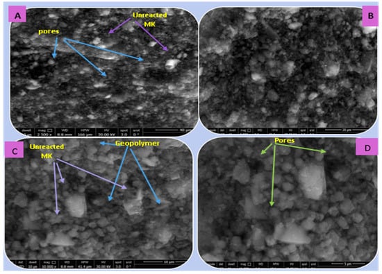 SEM micrographs of the geopolymer based on metakaolin incorporated with cement kiln dust (MC1) after 28 days of hydration at different magnifications: (A) 2500, (B) 5000, (C) 10,000, and (D) 15,000.