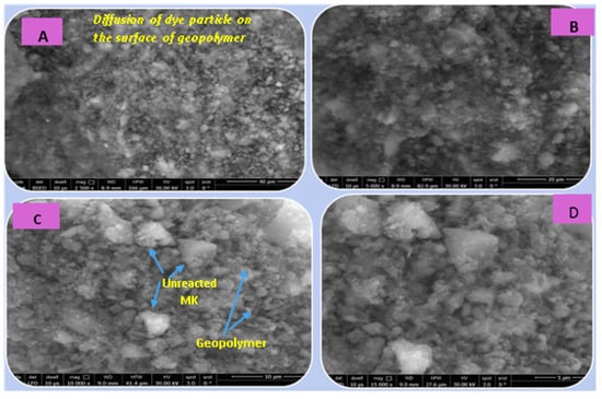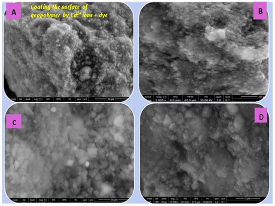 SEM micrographs of the geopolymer (MC1-BD-Cd2+) after 28 days of hydration at different magnifications: (A) 2500, (B) 5000, (C) 10,000, and (D) 15,000.