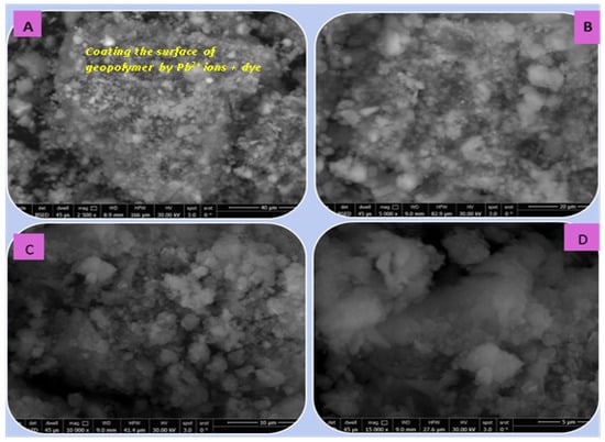 SEM micrographs of the geopolymer (MC1-BD-Pb2+) after 28 days of hydration at different magnifications: (A) 2500, (B) 5000, (C) 10,000, and (D) 15,000.
