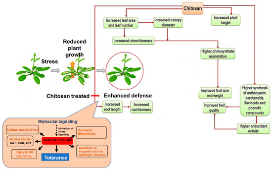 Composition, species, size, and the stage of growth of a plant, are factors that influence how chitosan functions [147]. Figure 3 shows a general description of chitosan-mediated plant growth regulation.