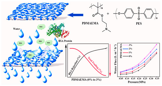 In the present study, we described the fabrication of new blended polymer membranes by the inclusion of PDMAEMA in the casting solution of PES. The primary objective of this research is to analyze the effect caused by the presence of PDMAEMA on the surface morphology, antifouling behavior, and filtration capabilities of PES/PDMAEMA-blended UF membranes. Thermogravimetric analysis (TGA) was used to examine the thermal stability and compatibility of PES/PDMAEMA-blended polymer membranes. Scanning electron microscopy (SEM), water contact angle measurements, and atomic force microscopy (AFM) were used to examine the impact of incorporating PDMAEMA on the morphology and hydrophilicity of blended polymer membranes. Moreover, newly fabricated polymer membranes were tested for their antifouling properties and filtration performance by filtrating bovine serum albumin (BSA) and water flux. A graphical overview of the present work is presented in Figure 1.
