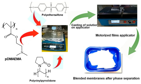 The polymer membranes in this work were fabricated by phase inversion method, as reported previously, with some minor modifications [49,50]. Figure 2 represents the process of fabrication of membranes. PES powder was at first dried for 6 h at 50 °C. The PES cast solution, which contained 20 wt.% of PES in a solvent mixture of NMP and DMSO (4:1 w/w) and pore-forming polymer PVP (2% wt.%), was applied as a base polymer. Various concentrations of PDMAEMA were added in the mentioned solvent mixture, and then the mixture was thoroughly stirred for 3 h at 60 °C. Four types of ultrafiltration membranes were fabricated, which contained different concentrations of PDMAEMA, as shown in Table 1. The casting solution was then left for 24 h on magnetic stirring at room temperature, followed by degassing for 30 min. After homogeneous casting solution was formed, it was casted on polyester support using an Automatic film applicator (AFA-IV en-Moderner electromotor, Shanghai Modern Environment Engineering Technique Co., Ltd Shanghai, China). After applying the film, support was submerged in a casting tray filled with deionized water for 30 min. Twenty-four hours of room temperature air drying were performed on the solidified membranes produced on polyester support.