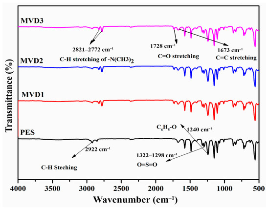 Spectroscopic analysis of PES and PDMAEMA/PES blend membranes is presented in Figure 4, showing almost identical absorption peaks. These blended membranes exhibited the typical PES basic structure characteristics. The peaks at wavelengths 2821 cm−1 and 2922 cm−1 indicated the existence of -C–H stretching and the aromatic ring of the = C–H bond, respectively. Moreover, all the samples showed identical peaks at 1673 cm−1 and 1578 cm−1 representing C=C stretching vibrations of ester carbonyl group peaks [52]. Furthermore, peaks at 1322 cm−1 and 1240 cm−1 were linked with ether linkage between phenyl groups. PES via asymmetric vibrations of O=S=O asymmetric stretching bonds were shown by the presence of peaks at 1482 cm−1 [49,52].The peaks at 1151 and 1106 cm−1 have shown sulfone group presence in the PES base structure [1].
