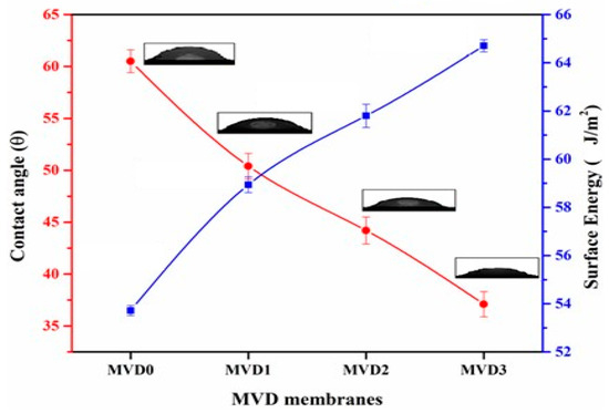 The surface energy of the blended membranes was estimated by adding PDMAEMA, as given in Table 2. The pristine PES membrane exhibited the surface energy at 53.72 J/m2. As the roughness of these modified polymer membrane surfaces increased and the contact angle decreased, the surface energy increased for MVD1, MVD2, and MVD3 at 58.94, 61.80, and 64.71 J/m2, respectively. Figure 5 presents the increase in surface energy caused by decreasing the contact angle. These values are affected by the physio-chemical interaction with the water molecule. Equation (9) was used to calculate the apparent surface energy by combining the equilibrium contact angle, Chibowski correlation, and the Young equation [56].