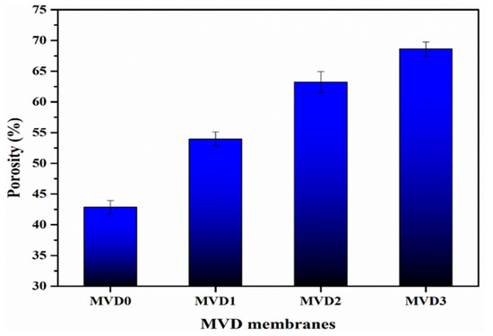 The MVD1 sample has shown higher porosity (53.94%) values, indicating more water intake (37.80%). Similarly, by increasing the proportion of hydrophilic polymer, porosity in MVD2 and MVD3 also increased to 63.23% and 68.62%, respectively. Water intake was also observed for both the MVD2 and MVD3 membranes at 40.15% and 42.45%, respectively. Due to the relatively higher number of pores, it was noticed that the water intake and porosity of the membranes with a higher concentration of polymer were greater than other membrane samples. Figure 6 shows the results of the porosity measurements, which shows that by adding PDMAEMA, the porosity of the membrane was found to be increasing. Pore formation would be facilitated by the presence of hydrophilic PDMAEMA. Therefore, increasing the concentration of PDMAEMA in the membranes causes the development of higher number of pores, which leads to an increase in porosity [49]. According to these observations, the presence of additives enhances the porosity of the membranes in general. It is evident that as the additives are increased, porosity rises due to the development of larger finger-like cavities [28].