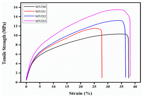 Similarly, elongation at break of the polymer membranes also enhanced with increasing PDMAEMA concentration, that is, 27.76%, 36.44%, and 38.16% for MVD1, MVD2, and MVD3 membranes, respectively, as shown in Figure 8. The increase in mechanical properties is attributed to PDMAEMA, which is well-known for its mechanical strength, as well as the better ability of dispersion of PDMAEMA in the membrane solution, which results in a solid contact between PDMAEMA and the polymer matrix. Furthermore, the presence of PDMAEMA inhibits the development of macrovoids, enhancing the mechanical characteristics of membranes. It also demonstrates that MVD3 composite membranes have the highest tensile strength of the other modified membranes. Also, the crosslinking density rises to a considerable level as the content of DMAEMA increases, perhaps improving tensile strength [59].