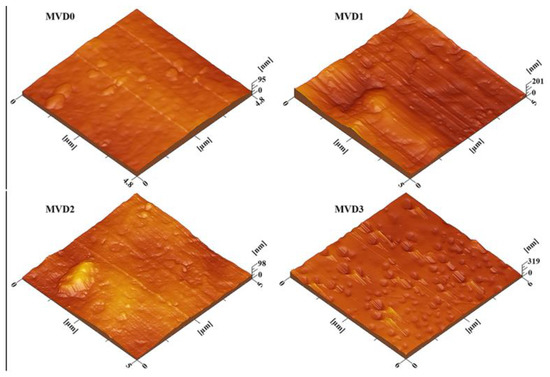 Three-dimensional AFM images of pristine PES membrane (MVD0), PES with 1% PDMAEMA (MVD1), PES with 2% PDMAEMA (MVD2), and PES with 3% PDMAEMA (MVD3).