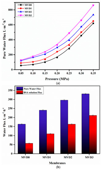 The flux rate of the modified membranes is significantly higher than the pristine and keeps on increasing with respect to the PDMAEMA concentration. These results are in accordance with the previous reports in which somewhat similar hydrophilic polymers were embedded into the PES membrane [60,61]. Figure 11b shows a comparative behavior between the flux of pure water and BSA solution. BSA is widely known for its sticky characteristics, which is why it is generally used as a model protein [15]. As compared to pure water, the flux rate of BSA at 1000 ppm is much lower [51]. For example, at a particular pressure of 0.2 MPa, the pure water flux was noted as 163.16 L·m−2·h−1, whereas the BSA solution flux was recorded at 57.26 L·m−2·h−1. Similarly, increasing the amount of PDMAEMA in both pure water and BSA solution showed a noticeable enhancement in the flux rate. As for the MVD3 membrane having 3 wt.% PDMAEMA, the flux for pure water increased up to 330.40 L·m−2·h−1 as opposed to 211.45 L·m−2·h−1 for the BSA solution. All the fabricated membranes showed a rapid flux decline while filtrating BSA solutions when compared with the pure water from the membranes. This variation may be because of the deposition of BSA on the membrane surface by blocking the pores and channels [62]. This observed change in the flux rate can be due to the higher porosity and complex structural feature of both PDMAEMA and BSA protein that promote their permeation through the membranes under pressure.