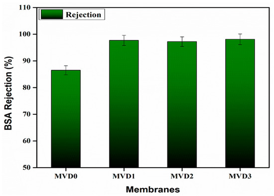 Figure 12 depicts the percentage of BSA rejection by the membranes. Except for the neat PES membrane, the rejection characteristics of other modified membranes were almost similar. It was analyzed that the PDMAEMA-added membranes presented a higher BSA rejection than the pure PES membranes. The BSA rate of rejection by the pure PES membrane (MVD0) was about 87%, while the rejection rate of all membranes added with PDMAEMA was almost 98%. This is because the surfaces of the PES/PDMAEMA membranes had a relatively better hydrophilic nature. This result might be due to improved surface hydrophilicity, larger pore sizes, and improved membrane structure [51]. One of the possible reasons may be the presence of carboxyl groups, having interactions between water molecules and carboxyl groups, as well as the protonation of the hydrophilic polymer.