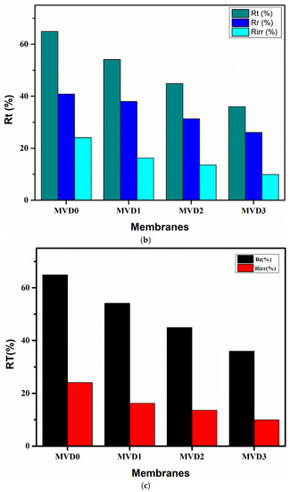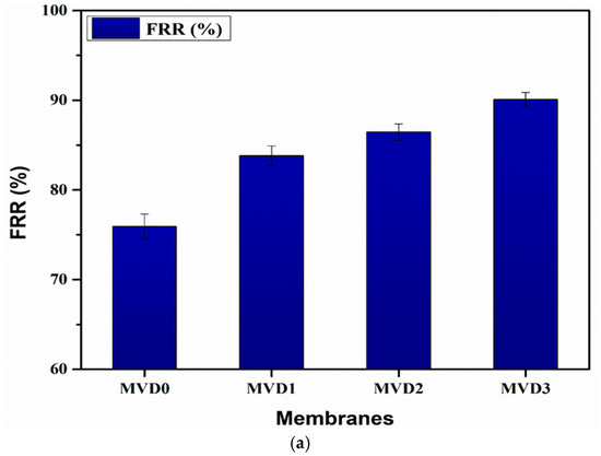 The membranes underwent thorough cleaning after filtrating the BSA solution, and to evaluate water flux once again. The increase in the water flux was seen as indicating the maximum removal of the BSA molecules from the membrane surface after the washing process. This suggests a better flux recovery. The flux recovery ratio (FRR%) for each membrane was determined based on the flux values obtained to estimate the membrane’s antifouling capacity. The flux recovery ratio of the membranes is basically a measure of their antifouling characteristics. The antifouling performance improves as the FRR value increases [9]. MVD0 has the least FRR value, which is about 75.9%, whereas the FRR value has increased as the percentage of PDMAEMA increased in the PES membranes, as shown in Figure 13a. The FRR value was observed as 83.8%, 86.5%, and 90.0% for MVD1, MVD2, and MVD3, respectively. A higher FRR value also suggested that the higher number of adsorbed BSA particles were eliminated from the surface of membranes during the washing process.