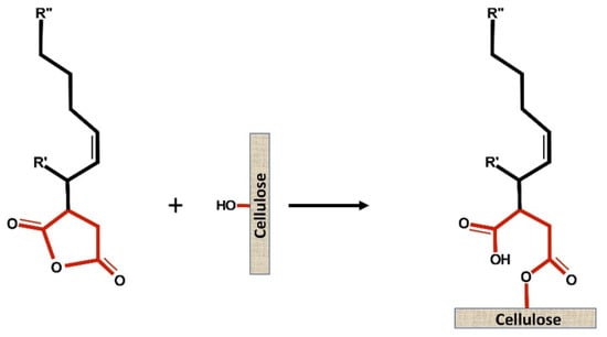 The proposed and widely cited ASA sizing mechanism is the formation of an ester or covalent bond between ASA molecules and fibers. Figure 1 illustrates the ester bond formation between ASA and fiber (cellulose). However, during the last 60 years of papermaking research, this popular mechanism has been questioned. Several scientists are still uncertain about the binding mechanism between ASA and cellulose. In addition, most scientists agree that ASA hydrolyzes in water during the papermaking process (Figure 2) [,,,].
