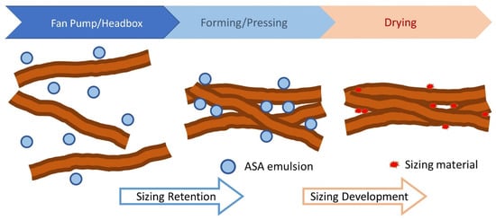 Figure 3 shows the main steps of the ASA sizing process; the oil (ASA) is first emulsified and then applied to the pulp. The pulp is drained and pressed to form a sheet. Sizing is developed after the sheet is dried.