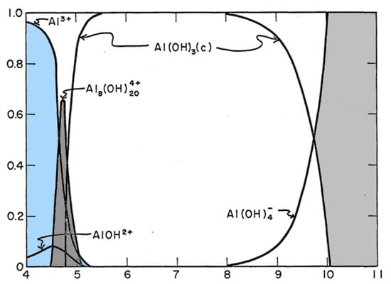 Distribution of Hydrolyzed Aluminum (III) as a Function of pH. Al (III) = 1.0 × 10−3 M, 24 h (Adopted from Rubin and Hayden []).