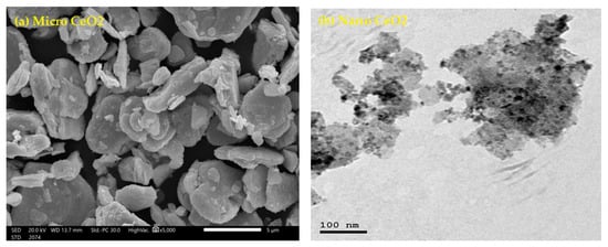 SEM and TEM images of micro and nano CeO2, respectively. (a) SEM of micro CeO2 and (b) TEM of nano CeO2.