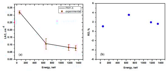 To ensure the validity of the experimental values, the online Phy-X software was used to calculate the LAC of the pure SR composite. The Phy-X software can calculate the shielding values for photon energies between 0.015 MeV and 100 GeV for the molecular or elemental structure of any material [30]. The software accounts for the chemical makeup and density of the constituents while calculating these characteristics. Different shielding parameters, such as LAC, MFP, HVL, and TVL, can be calculated for each material. The relative deviation of 2 results is given by: