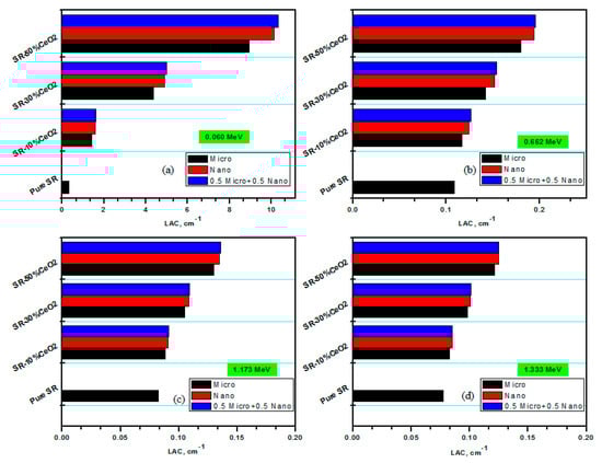 In Figure 5, we presented the LACs for the pure SR and for the SR with 10, 30, and 50% of micro and nano CeO2. It is evident that regardless of whether the CeO2 is micro or nano, the LAC of the SR increases with increasing CeO2 concentration. This is due to the inclusion of the high atomic number elements (i.e., Ce with Z = 58).The pure SR has a lower LAC than all other SRs with CeO2. Therefore, increasing the amount of bulk CeO2 or NPs that are included within the SR can improve its ability to shield gamma photons. However, the speed at which the LAC increases is dependent on the energy of the photon that is being emitted. When CeO2 is added, the LAC value is shown to increase considerably at low energies; however, at high energies, the LAC value just slightly increases when CeO2 is added. This is due to the fact that the photoelectric effect is the most important process at low energy, and it is known that the cross section of this process highly depends on the atomic number of the materials. So, as we added CeO2, there was a notable increase in the LAC. However, at higher energies, the Compton scattering is the main photon–matter interaction process, and the cross section of this process has a weak dependence on the atomic number of the shielding materials, so we noticed a small increase in the LAC due to the addition of CeO2 at higher energies. The following section considers nano CeO2 and investigates how much the LAC increased for the lowest and highest measured energies.