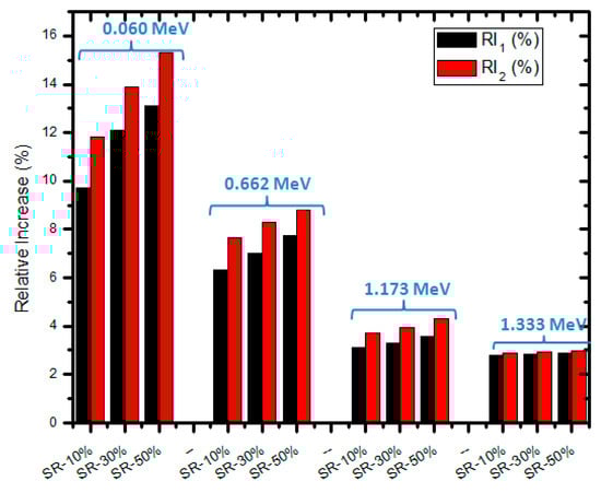 The relative increase (RI, %) between the LAC values at each level of CeO2 was calculated in order to better understand the difference between the shielding effectiveness of micro and nano CeO2-SR (RI1) as well as the difference between the shielding effectiveness of micro and 0.5 micro + 0.5 nano CeO2-SR (RI2) against gamma photons. The ratios for the SR with 10, 30, and 50% CeO2 are displayed in a histogram in Figure 6. It is clear that as photon energy increases, the relative increase drops, highlighting how significantly CeO2 influences the SR ability to attenuate radiation at low energies. Additionally, it is evident that 30% CeO2 has a greater relative increase than 10% CeO2. The maximum RI (%) was reported for 50% CeO2 NPs at 0.059 MeV and is 31.10% and 15.30% for RI1 and RI2, respectively. Consequently, it can be stated that CeO2 nanoparticles are a more promising material to use in the development of efficient shielding materials than the micro particles, while the combination of both sizes of CeO2 gave better shielding development and a lower cost.