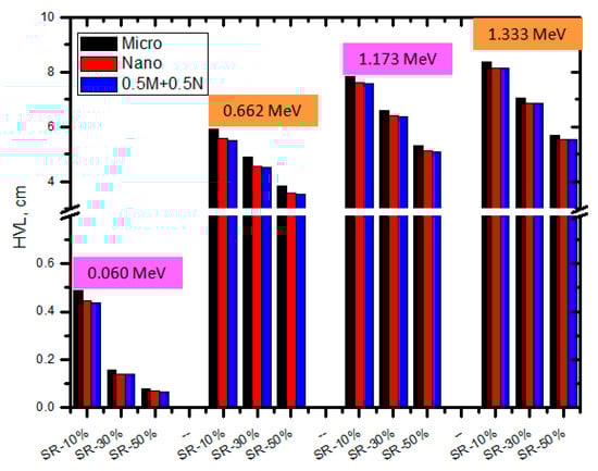 The half value layers (HVL) of the SR with micro and nano CeO2 and the SR with CeO2 in both sizes (i.e., 0.5 M−0.5 N) at the examined energies were plotted in Figure 7. We observed that the HVL values of the SR with CeO2 were smaller than those of pure SR when comparing the HVL for the SR with micro and nano, indicating that the addition of CeO2 to the SR results in superior attenuation. The SR with 10% micro CeO2 has a greater HVL than the SR with 10% nano CeO2, as seen in Figure 6. In the meantime, SR with 30% micro CeO2 had a greater HVL than SR with 30% nano CeO2. This is due to the fact that the LAC for the SR with nano is higher than that of SR with micro CeO2 and it is known that the HVL has an inverse relation with the LAC according to the basic formula (HVL = 0.693/LAC). The same results are also correct for the SR with 50% CeO2. This finding demonstrated that the SR containing nanoparticles had a higher attenuation effectiveness than the SR with micro CeO2. When we compare the HVL of the SR with nano CeO2 and the HVL of SR with 0.5 M−0.5 N, we found that the HVL of the SR containing both sizes (micro and nano) is lower than the HVL of the SR with nano CeO2. For example, the HVL for SR with 10% nano CeO2 at 0.059 MeV is 0.443 cm, while it is 0.434 cm for the SR with 5% micro and 5% nano CeO2. For these two samples, the HVL at 0.662 MeV is 3.622 and 3.355 cm. This again confirms the importance of using both micro- and nano-sized CeO2 in the SR in order to improve the radiation shielding performance. Additionally, it is possible to note from Figure 7 that as the energy increases, the HVL increases for the pure SR in addition to the SR with micro CeO2 and nano CeO2; consequently, a thicker absorber is desirable in order to reduce the intensity of the radiation by half.