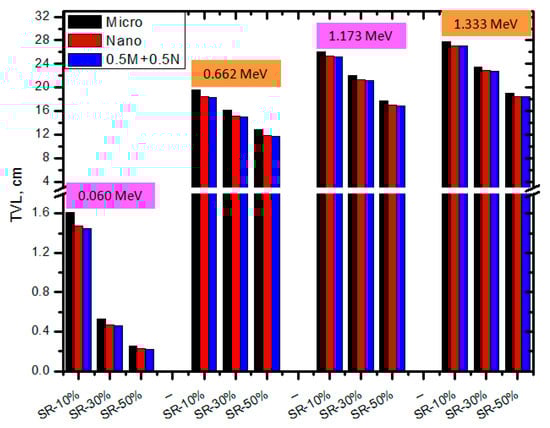 Figure 8 displays, in a manner analogous to that of HVL, the 10th value layer (TVL) for the pure SR and the SR containing micro and nano CeO2, respectively. The TVL declined when CeO2 content was increased, as was expected, giving pure SR the highest TVL. Given that Ce is known to have a high atomic number, an increase in the likelihood of interactions between photons and the Ce atom could provide a reasonable interpretation for this tendency. The TVL values of the SR that contains nano CeO2 were lower than those containing micro CeO2 according to the analysis of the TVL for the SR doped with micro and nano CeO2. As a result, nano CeO2 is an effective photon shield. The HVL results and this outcome are consistent. These findings suggest that adding nano CeO2 to the SR significantly improves its shielding characteristics compared to using micro CeO2. When comparing the TVL for the SR with only nanoparticles and the SR with both micro and nanoparticles (i.e., 0.5 M−0.5 N), we found that the samples containing both sizes have a lower TVL than the SR with only nanoparticles. For example, the TVL for SR-10% nano CeO2 is 12.03 cm at 0.662 MeV, and it is 11.14 cm for the SR with 5% micro and 5% nano CeO2. It is clear from Figure 7 that the TVL is influenced by the energy of the radiation. Numerically, for the SR with 30% micro CeO2, the TVL increases from 1.61 to 19.65 cm between 0.059 and 0.662 MeV. We noticed the high difference in the TVL for the same sample between low energy (i.e., 0.059 MeV) and moderate energy (i.e., 0.662 MeV). For this composition, the maximum TVL is 27.85 cm, which was reported at 1.333 MeV.