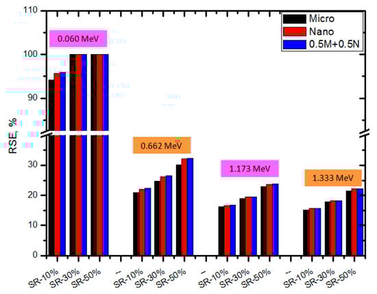 Another advantageous parameter is the RPE. This gives explicit information about the efficacy of the particle size, which depends on the RPE of the manufactured SR. The findings of the RSE were presented in Figure 8 for the SR samples that had thicknesses of 2 cm. According to this statistic, pure SR has a lower RPE than any SR that contains micro or nano CeO2. This result indicates that integrating CeO2 into SR is a significant way to improve the shielding efficiency of the SR samples. This is due to the fact that Ce is a heavy element, and the addition of CeO2 to the SR will increase the likelihood that interactions will take place. In addition, looking at Figure 9 reveals that the RPE of the SR treated with nanoparticles is more than that of the SR treated with micro particles when both treatments were given at the same weight fraction. For example, at 0.059 MeV, the RPEs for the SR with 10% micro and nano CeO2 are 94.2 and 95.6%, respectively, while they are 20.9 and 31.8% for the same samples at 0.662 MeV. This result once again indicates the fact that the attenuation ability is improved when utilizing the nano CeO2 as opposed to the micro CeO2. In addition, the findings demonstrated that the SR samples exhibit their highest level of attenuation at 0.059 MeV. The RPE is almost 100% at 0.059 MeV, which means that the SR samples with micro or nano CeO2 can attenuate almost all the radiation with an energy of 0.059 MeV. The RPE at 0.662 MeV decreases 20–30% for the SR with micro CeO2, 31–47% for the SR with nano CeO2, and 34–49% for the samples with both micro and nano CeO2.
