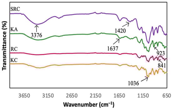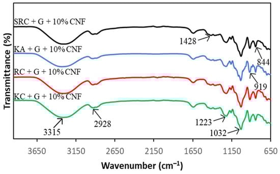 FT-IR spectroscopy presented information about the chemical composition and specific functional groups of the carrageenan-based films for this study. Figure 1 and Figure 2 show the spectra of the absorption bands between 650 cm−1 and 3600 cm−1 for KA-, KC-, RC- and SRC-based films incorporated with 10% of CNF.