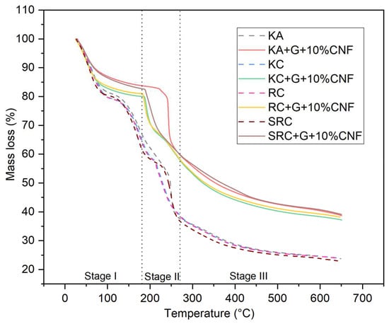 TGA thermograms representing the thermal degradation behavior of biofilms with different biopolymer and cellulose nanofiber concentrations are presented in Figure 3.