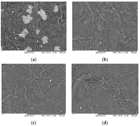 SEM was used to examine the surface morphological features of the seaweed derivatives and cellulose nanofiber matrices, revealing the detailed surface structure of the film samples such as cracks, roughness, and nanoparticle distribution. Four selected samples were chosen to investigate their morphology based on mechanical and physical properties. The morphology of carrageenan films can vary, depending on the specific type of seaweed derivatives and the processing conditions used to prepare the film. As shown in Figure 5a, the surface of KA + G + 10%CNF appeared to be slightly cracked, rougher, and with larger lumps and dents compared to Figure 5b–d.