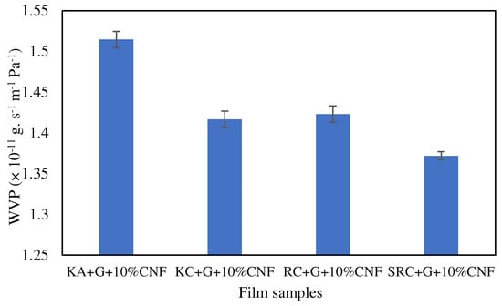 Water vapor permeability (WVP) refers to the ability of a material to allow water vapor to pass through it. The WVPs of the KA-, KC-, RC- and SRC-reinforced 10% CNF bio-nanocomposite films are shown in Figure 6.