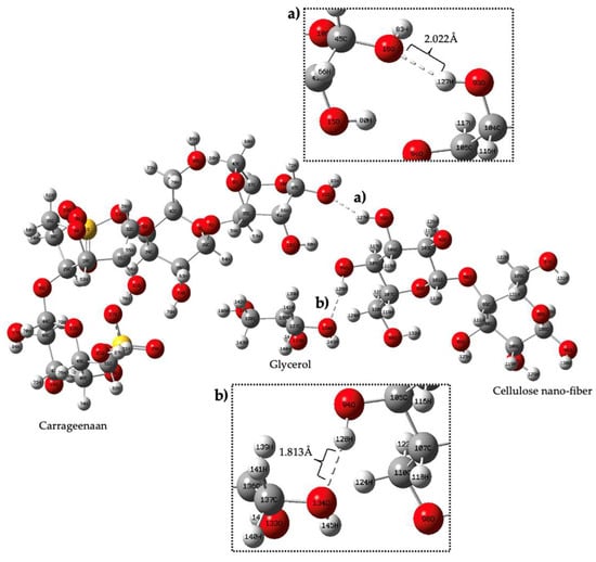 According to this figure, the electron potential increases with increasing electron density, with blue denoting the lowest electron density and red denoting the highest electron density. This indicates that the red-colored regions have a higher electron density than the blue-colored regions. It further states that, according to the Mulliken charge, a measure of partial charge distribution within a molecule, the oxygen atom in Region A of carrageenan has negative electrostatic potential and the hydrogen atom in Region B has positive electrostatic potential (yellow). Meanwhile, hydrogen bonding between Region C (atom H) and Region D (atom O) was determined based on their electrostatic potential blue color and yellow color, respectively. According to Kollman and Leland, a hydrogen bond is a type of chemical bond that occurs between a hydrogen atom and an electronegative atom such as oxygen, nitrogen, or fluorine in another molecule. It is an electrostatic attraction between a positively charged hydrogen atom (which is covalently bonded to one electronegative atom) and the lone pair of electrons on the electronegative atom of another molecule. The range of a hydrogen bond depends on a number of factors, including the strength of the bond and the specific atoms and molecules involved. In general, the distance between the hydrogen atom and the atom it is bonded to (typically nitrogen, oxygen, or fluorine) is typically between 1.5 and 2.5 angstroms (Å) [56]. In general, stronger hydrogen bonds tend to have shorter bond lengths and higher bond energies, while weaker hydrogen bonds have longer bond lengths and lower bond energies. Figure 8 shows the formation of a hydrogen bond between three different functional groups, namely carrageenan, cellulose nanofiber and glycerol.
