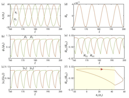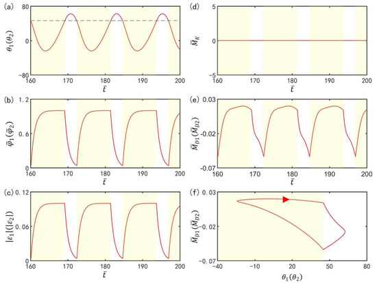 To investigate the mechanism of the self-excited oscillation in anti-phase mode of the two LCE oscillators under steady illumination, Figure 11 presents time histories of some key physical quantities of the anti-phase mode in Figure 2a,c. Figure 11a plots the time histories of and , which show that the two LCE bars oscillate periodically in anti-phase mode. Figure 11b plots time histories of the number fractions of cis-isomers in the two LCE bars. Similarly, the number fractions of cis-isomers also increase in the light zone while decreasing in the dark zone. Therefore, the contraction strains in the two LCE bars increase in the light zone while decreasing in the dark zone, as shown in Figure 11c. In Figure 11d, the moment of the torsion spring on the two bars changes periodically, because the angle difference between the two bars in anti-phase mode varies periodically. In Figure 11e, the driving moments of the two oscillators in anti-phase mode also fluctuates periodically. Figure 11f delineates the dependence of the driving moment on or . In Figure 11f, the area surrounded by the closed curve represents the net work performed by the steady illumination during one cycle of the self-excited oscillation, which compensates for the energy loss caused by damping to maintain the oscillation of the LCE oscillators.