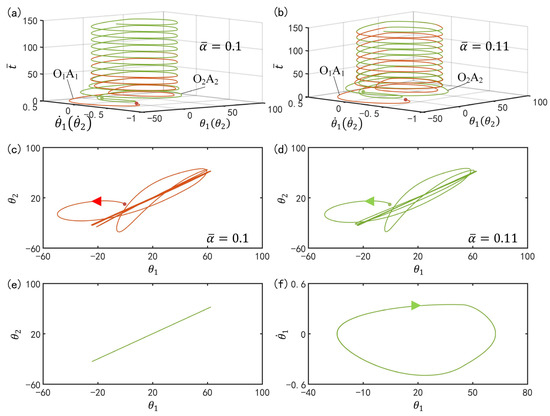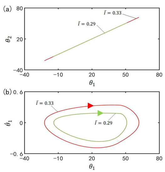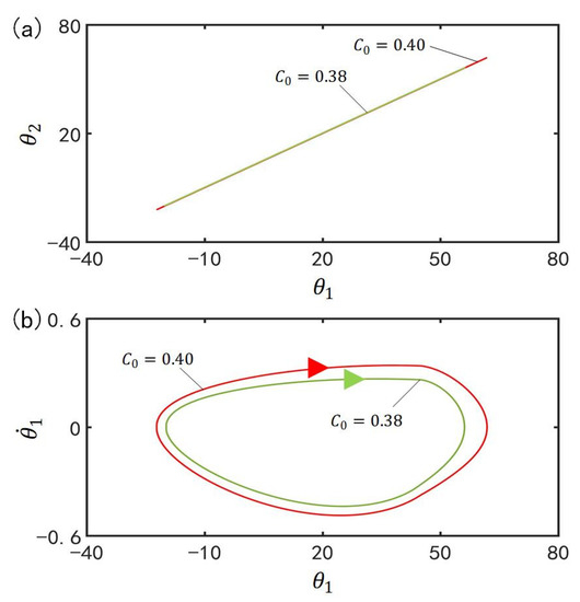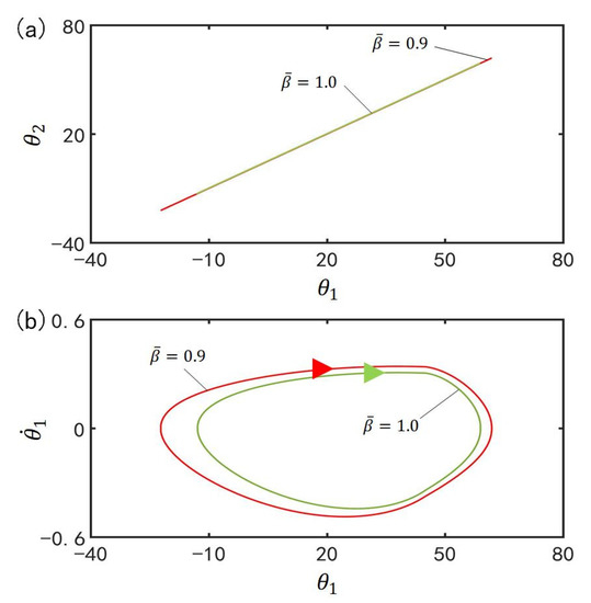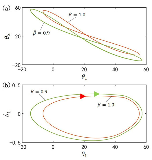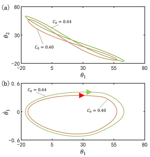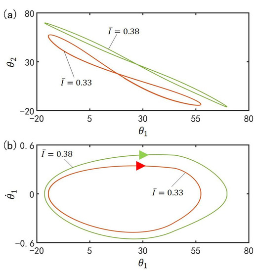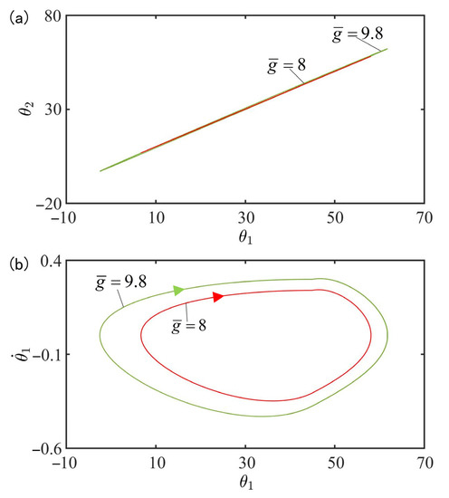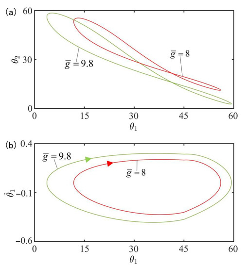 Figure 10 plots the effect of gravitational acceleration on the in-phase mode for , , , , , , , , , , and . Figure 10a plots the domains of attraction of and for different gravitational accelerations. Furthermore, Figure 10b describes the limit cycles of and for different gravitational accelerations. The results show that the amplitude increases with the increase of gravitational acceleration. According to the physical meaning of , the larger is, the slower the cis-to-trans conversion is and therefore, the smaller the total moment , is, as shown in Equation (7), and the larger the amplitude are.