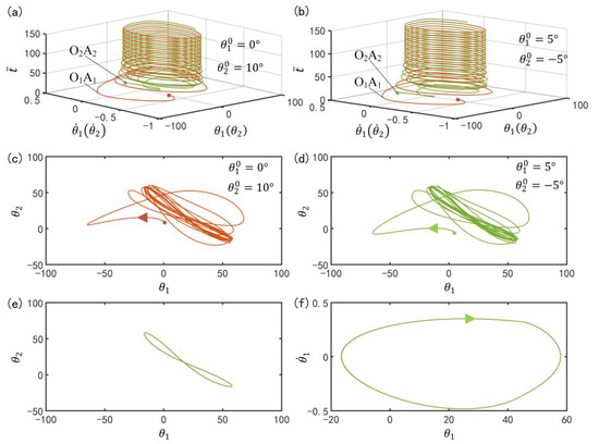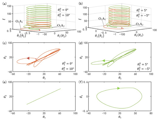 Figure 6a,b plot the time–histories for two different initial conditions. In the computation, we set , , , , , , , , and . In Figure 6a,b, for the two different initial conditions, the two curves of the two LCE oscillators coincide after a period of time, which means that the two bars oscillate synchronously in in-phase mode. Figure 6c,d plot the phase diagrams for the two initial conditions, in which and evolve from the initial disorder into a final attraction domain. Figure 6e further plots the domains of attraction of and for different initial conditions. The calculation shows that the two domains of attraction are the same. The results show that the initial condition has no effect on the synchronous mode.