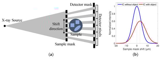 Edge illumination XPCI (EI-XPCI) is a phase contrast imaging technique that employs two absorbing masks with parallel aperture slits to introduce sensitivity for three complementary contrasts: attenuation, phase and dark field contrast [24]. The sample mask is placed in front of the sample and splits the X-ray cone beam emitted by the source into multiple smaller beams, called beamlets. The beamlets traverse through the sample and towards the detector, each beamlet corresponding to one pixel. In front of the detector, a detector mask is placed such that the apertures coincide with the center of each pixel, while the pixel edges are covered. Then, to extract the complementary contrasts, the sample mask is shifted multiple times parallel to the detector plane, as shown in Figure 1a, and an image is acquired at each sample mask position. This so-called phase stepping of the sample mask causes the measured intensity to vary with the position of the beamlet in each pixel. The resulting relation between the measured intensity and the position of the sample mask is characterized by the illumination curve (IC), which is typically modeled as a Gaussian function. When a sample is introduced behind the sample mask, the beamlets will interact with the material, leading to attenuation, refraction and scatter. In this way, the surface area under the IC is reduced, the IC peak position shifts and the IC broadens, as illustrated in Figure 1b. Finally, the three contrasts can be extracted from a pixel-by-pixel based comparison between the IC with and the IC without sample [27].