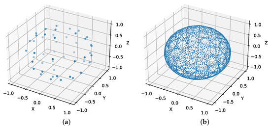 The dark field signal is linked to the X-ray scattering properties of the microstructures inside a voxel. The magnitude of this scattering is anisotropic because it depends on the direction of the X-rays relative to the fiber orientations. Additionally, the scatter magnitude varies depending on the sensitivity direction of the phase contrast imaging setup. With EI-XPCI, the sensitivity direction is orthogonal to the aperture slits and is thus determined by the orientation of the masks. That is, the dark field signal is a function of both the beam direction and the sensitivity direction of the EI-XPCI setup [33]. In our simulation study, we focussed on the simplest acquisition scheme discussed by Sharma et al. [34]. We generated a set of 50 sensitivity directions, distributed on the full unit sphere, based on a bipolar electrostatic repulsion model [35]. Then, each sensitivity direction was sampled with 100 beam directions, resulting in a total of 5000 projection angles. Due to the nature of the EI-XPCI setup, the beam direction is always orthogonal to the sensitivity direction. Hence, the beam directions were distributed equally spaced on a circle in the plane orthogonal to each sensitivity direction. In practice, this results in a sequence of standard circular CT-trajectories, one for each sensitivity direction, wherein the rotation axis of the sample is parallel to the sensitivity direction. The generated sensitivity directions and corresponding beam directions are shown in Figure 2. The symmetry of the dark field signal can be used to generate additional data, since the dark field signal corresponding to a certain sensitivity direction is equal to the dark field signal of the opposite sensitivity direction, resulting in a set of 100 sensitivity directions in total.