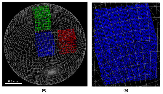 The sample consisted of an epoxy sphere ( radius) with a density of 1 . The epoxy sphere enclosed three cubic shaped regions ( wide) that were filled with carbon fibers that had a diameter of 4 and a density of . Fiber positions were generated using Poisson disk sampling to ensure a tightly packed randomized distribution, while avoiding overlapping fibers [42]. The epoxy sphere and the three fiber regions are depicted in Figure 3, where the blue fiber region in the center of the sphere contained 2403 parallel fibers in the z-direction with a length of 500 , equal to the side of the cubic region. The red and green fiber regions contained crossing fibers. Half of the fibers pointed in the z-direction. The other half of the fibers were rotated around the y-direction to introduce a crossing angle. However, to ensure that the crossing fibers did not overlap, each voxel of the region was divided in two sub-voxel sectors of , each containing only fibers of the same orientation. Therefore, the fibers were shorter, with a length of 90 . In total, there were approximately 13,000 fibers in each cubic region with crossing fibers.