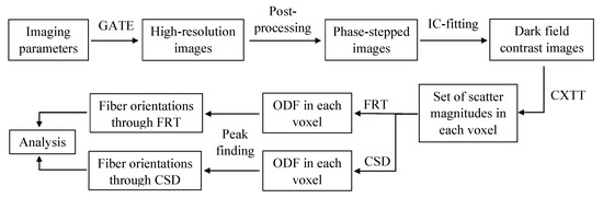 The FRT and CSD are compared with respect to their capability to estimate fiber orientations and the angle between crossing fiber populations. The workflow is depicted in Figure 4. First, all the imaging parameters were given to GATE in which the simulation was performed. As output, GATE yielded high-resolution images that were converted to phase-stepped images, as discussed in Section 2.2. Then, phase retrieval was performed on the images to retrieve the three complementary contrasts, resulting in 5000 dark field images of pixels. Next, these dark field images were reconstructed with 100 CXTT iterations to obtain the scatter magnitude for a set of 70 scatter directions in a volume of voxels (100 voxel size). Then, the ODF for each voxel is obtained by a FRT and CSD, where the maximal spherical harmonic degree of the ODF obtained by FRT and CSD was 10 and 14, respectively. The required response function was estimated by MRtrix3 from the region of parallel fibers in the center of the epoxy sphere. Finally, the local maxima in the ODF, which indicate the orientations of the fibers, are retrieved by a peak finding algorithm, as explained in Section 2.5.