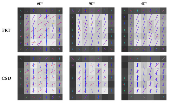 Additionally, individual ODFs calculated by the FRT and CSD, are shown in more detail in Figure 7 for a fiber crossing angle of 90, 70 and 40.